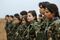 シリア・コバニで銃を構えるクルド人女性兵士(2014年11月資料写真: AP/アフロ)