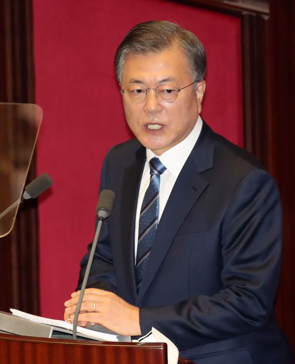 10月28日、国会で施政方針演説を行う文在寅大統領(写真:YONHAP NEWS/アフロ)