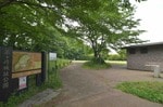 東京都調布市の深大寺(じんだいじ)城。深大寺の向かい側にある公園が城跡。発掘調査で見つかった建物跡が表示してある。