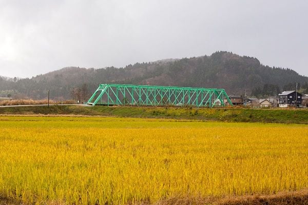 川沿いに点在する製菓工場や秋色の田畑の中を歩いて行くと、この写真のように突然視界に鮮やかな色の橋が飛び込んでくる。岩田橋は1958年(昭和33年)に設置された。以前は赤色だったが、2017年、翡翠をイメージするエメラルドグリーンに塗り替えられた。