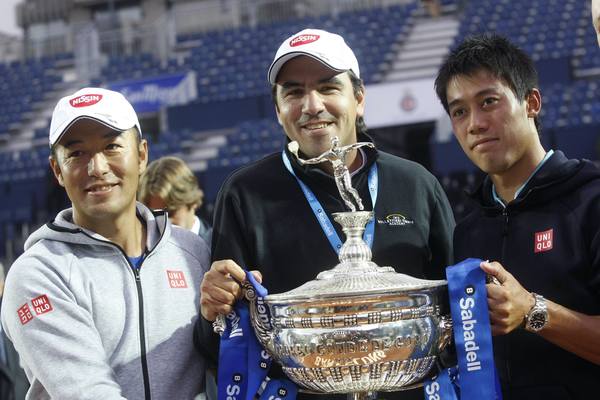 2015年4月に開かれたバルセロナ・オープン決勝、錦織圭が連覇を達成。左が中尾公一さん。 写真=Bagu Blanco/アフロ
