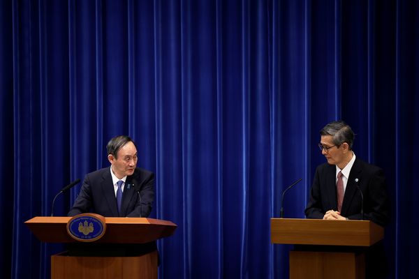 緊急事態宣言を出した後、記者会見する菅義偉首相(左)と政府の新型コロナウイルス感染症対策分科会の尾身茂会長(2021年1月7日、写真:代表撮影/ロイター/アフロ)