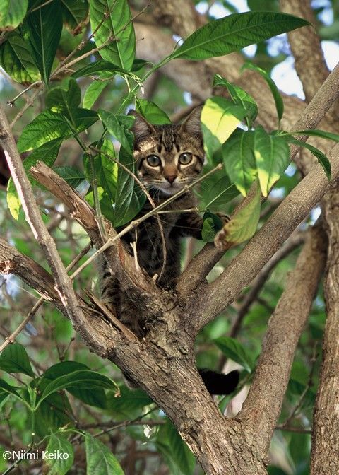 公園の木の葉が揺れたので、見上げれば猫。猫の実がなっている!? 二度見してしまいました。