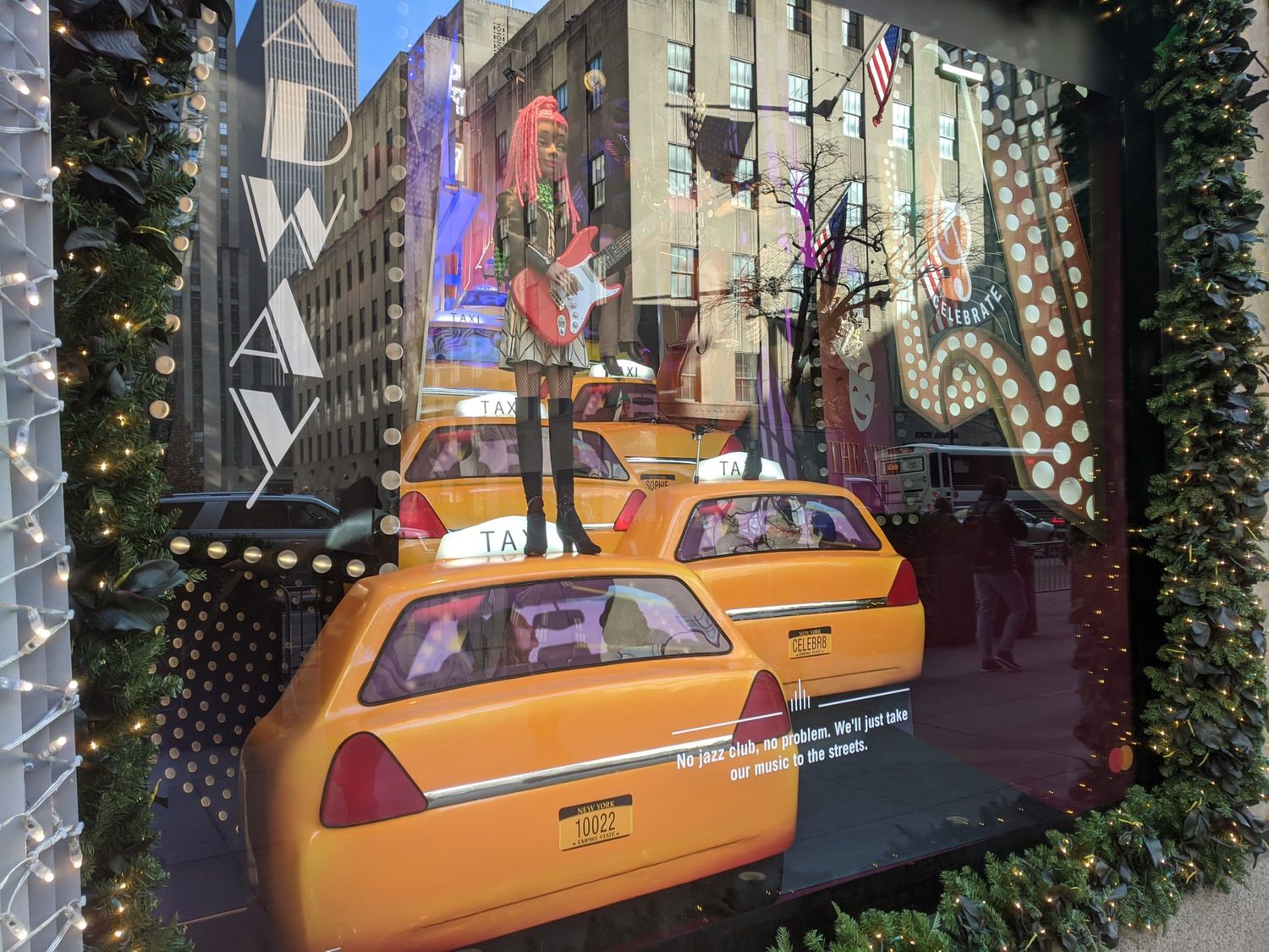 高級百貨店サックスフィフスアヴェニューのクリスマス名物ウィンドウデイスプレイ。キャプションには、“ジャズクラブがなくったって問題ないさ。われわれが街に音楽を持って行く”と