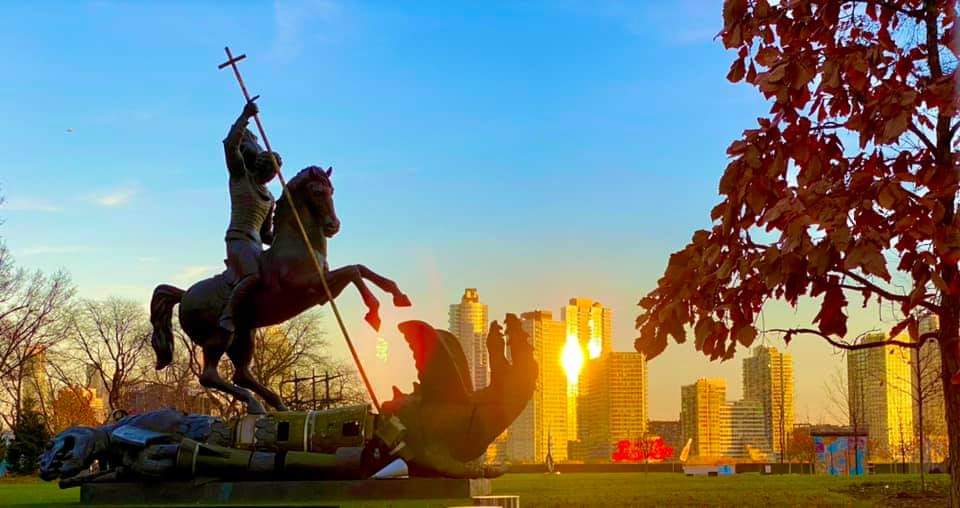 国連本部に隣接するガーデンに旧ソ連邦から贈られた大きなオブジェがある。ソヴィエトのSS-20ミサイルとアメリカのパーシングミサイルのパーツで作られたドラゴンをセント・ジョージが退治している姿である。題して”Good defeats evil."