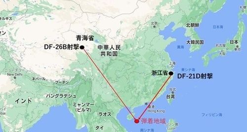 「関係筋によれば、無人で自動運行させていた古い商船を標的に、内陸部の青海省からDF-26B (射程約4000km)1発を先に発射。数分後、東部の浙江省からもDF-21D (射程約1500km)1発を発射した。ミサイル2発はほぼ同時に船を直撃し沈没させた」(図1参照)