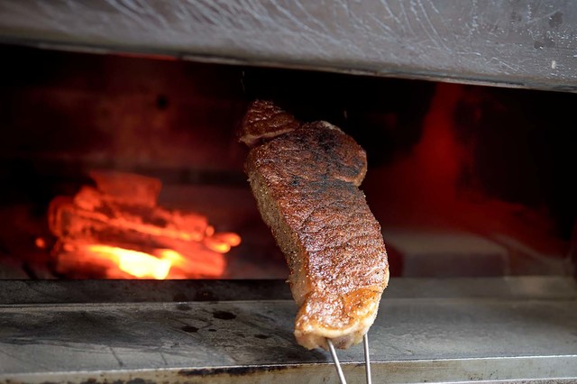 炉窯の紀州備長炭で焼かれた但馬牛のステーキ。サーロインは2~3cm、フィレは5~6cmと、部位ごとに適した大きさに切って焼かれる。但馬牛は神戸牛の素牛となる黒毛和種。「築地STEAK 哥利歐」では、月齢36カ月前後の雌牛が厳選されている