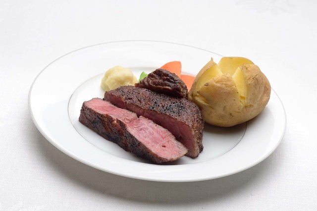 「特選但馬牛 炉窯炭焼ステーキコース」(3万円、税サ別)のメインの、但馬牛サーロインステーキ。コースにはステーキのほか、前菜3品、サラダ、炉焼温パン、温野菜とベイクドポテト、フルーツ、コーヒー、小菓子が付く