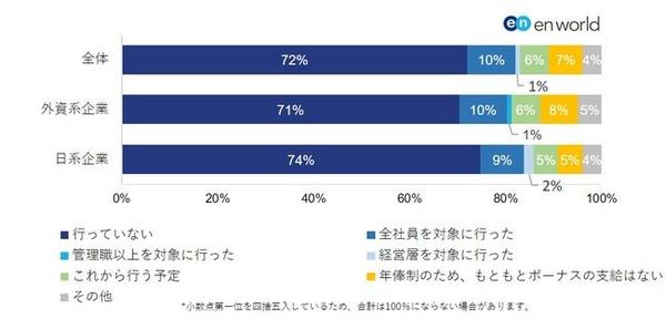 続いて、「新型コロナウイルスの影響による、従業員の賞与(ボーナス)カット実施の有無」を尋ねた。その結果、「行っていない」とした企業の方が多く、全体の72%(外資系:71%、日系企業:74%)にのぼった。