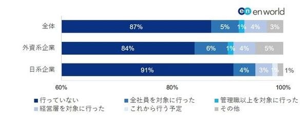 はじめに、「新型コロナウイルスの影響によって、従業員の給与カットを行ったか」と尋ねた。すると、「行っていない」とした企業が全体の87%(外資系企業:84%、日系企業:91%)で、全体の約9割にのぼった。一方で、「全社員/管理職以上/経営層以上のいずれかで給与カットを行った」という企業は、全体で10%(外資系:11%、日系:7%)であることが判明した。