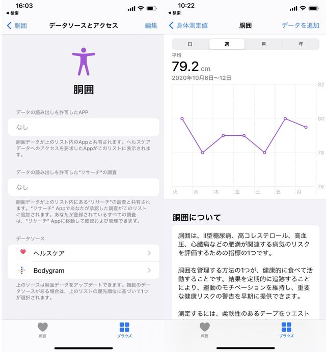 レイ はい。実は、iPhoneのヘルスケアとも連携していますので、Bodygramを連携して「胴囲」の推移をグラフ化し、日常的に健康リスクをチェックすることができます。
