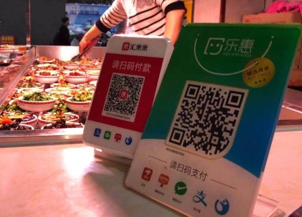食堂に置かれたQRコード。下に表示されている4種類または5種類のサービスで決済(モバイルペイメント)できる
