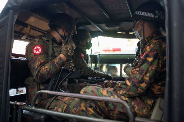 ヤンゴンのヒンドゥー教寺院の前で警備するミャンマー国軍の兵士(2021年2月2日、写真:ロイター/アフロ)