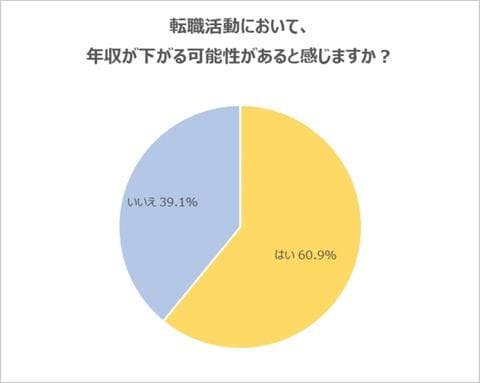 続いて、「転職活動において、年収が下がる可能性があると思うか?」と尋ねた。すると、60.9%が「はい」と回答。およそ3人に2人は「年収が下がる可能性」を感じていることが判明した。なお、前回の緊急事態宣言が発令された2020年4月時点で行った同様の調査では、「下がると感じている」と回答したのは47.7%で、増加傾向となっている。