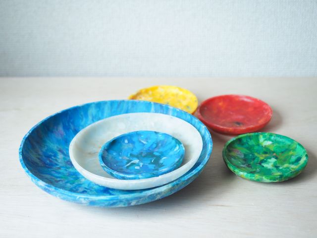 現在は、雑貨を載せるトレーやコースターを製作し、販売しています。そこで、色鮮やかなマーブル模様であることから、食器も製作すれば食品が映えるのでないか、と質問してみました。