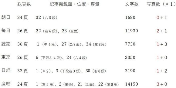 参考までに、全頁を文字数に換算した場合の天皇記事(写真を除く)の紙面占有率を割り出すと、約0.5%(朝日)、約4.9%(毎日)、約2.3%(読売)、約1.4%(東京)、約1.1%(日経)、約6.3%(産経)となり、朝日と産経が両極にあることが分かる。