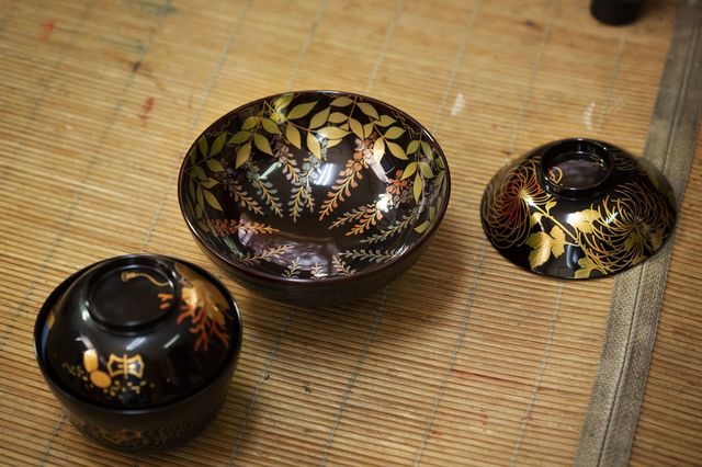 黒い漆の器に金色をふんだんに使って描かれた商品