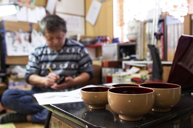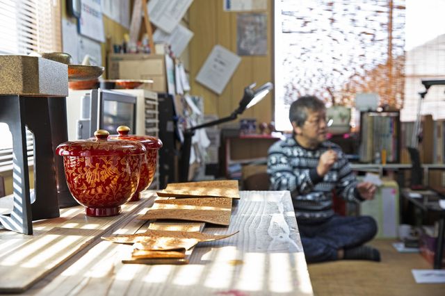 ここで越前市を離れて鯖江市に向かった。鯖江といえば眼鏡が有名で、ファッションに興味のある人なら聞いたことがある地名だと思う。それとは別に、この地にはもうひとつ、伝統工芸品、漆塗りの器「越前漆器」の工房が点在しているのである。まず組合がある「うるしの里会館」で越前漆器協同組合の大久保論隆さんと合流し、蒔絵師・森田昌敏さんの仕事場へ向かった。