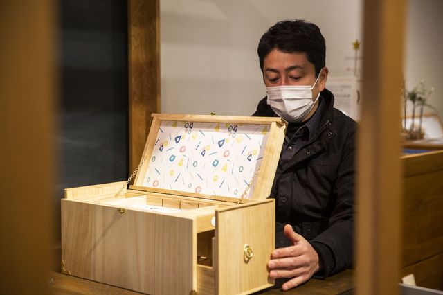 「コスメボックスといってますが、コレクションボックスとしても使えます。用途はお客さん次第です。それから、のんさんの水というテーマの絵が和紙に描かれ内装に貼り付けられます。外装に描くのかと思っていましたら、そこは表面の木の感じを残したいということでした」
