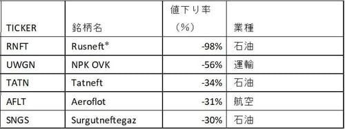 表2:ロシア取引所の2020年値下りのワースト5銘柄