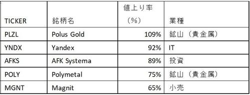 表1:ロシア取引所の2020年値上りのトップ5銘柄