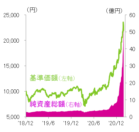 ファンドについて:純資産総額55億円、1年騰落率112.1%(2021年1月末時点)