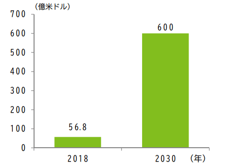 成長性:世界における自動運転車産業の市場規模は、2030年には約600億米ドルを見込む。(2018年~2030年における予想成長率は年率21.7%)