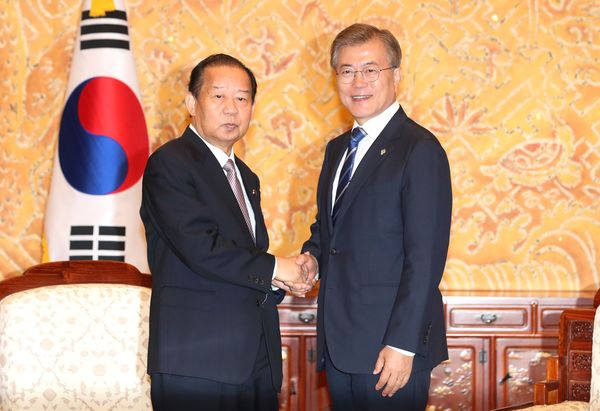 2017年6月、安倍晋三首相(当時)の特使として訪韓し、文在寅大統領と会談した二階俊博自民党幹事長(写真:YONHAP NEWS/アフロ)