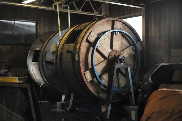 こちらはレザーを染色するために使うドラム槽。洗濯機のように回転させることで、染料が革に染み込みやすくなる。皮を革にするまでに要する期間は、およそ2週間。季節ごとにレシピ調整や温度管理など、細かく注意する必要がある