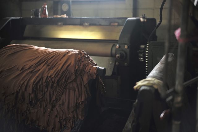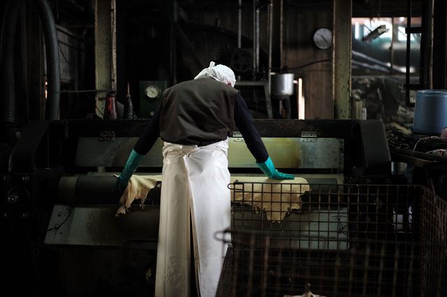 東京・墨田区のタンナー「山口産業」の作業風景。こちらは革を脱水する工程だ