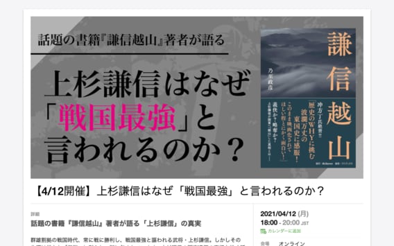重版出来記念イベント4月12日に決定 『謙信越山』著者が語る「上杉謙信」の真実 群雄割拠の戦国時代、常に戦に勝利し、戦国最強と謳われる武将・上杉謙信。しかしその生涯は様々な「伝説」に彩られ、謎に包まれています。上杉謙信の関東遠征の真相を描く話題の書籍『謙信越山』の著者が、謙信の戦い方や戦績を分析、その強さに迫ります。歴史ファンはもちろん、改めて謙信のことがわかる「入門編」としても楽しめるイベントです。ぜひご参加ください。 ※イベントの最後に、著者への質疑応答を予定しております。 ※4月7日12時より上記URLより概要がご覧いただけます。