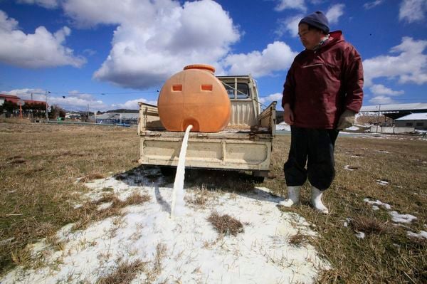 3月下旬、飯舘村のまだ雪の残る牧草地で、牛乳を棄てている人に出会った。軽トラックに積んだ大きなミルクタンクのホースの先から、勢いよく牛乳が流され出ていた。
