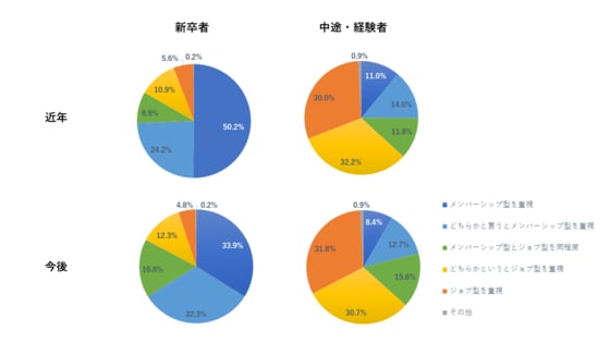 すでに中途者においては、「どちらかと言えば」を含めるとジョブ型を重視している割合が6割を超え、新卒者においては「今後」メンバーシップ型とジョブ型を同程度重視する割合が「近年」よりも7.7ポイント(8.9%→16.6%)増加、ジョブ型雇用への関心の高まりがうかがえる。日立や富士通など大手企業の「ジョブ型雇用導入」に関する報道を目にすることも多くなってきた。