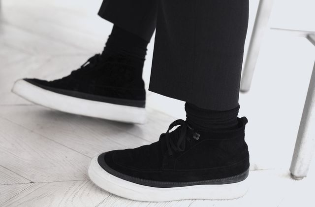 自身がデザインした〝LARDINI BY YOSUKE AIZAWA〟のスニーカー。プロダクトはできるかぎり自身で試して、可能な限りアップデートするという