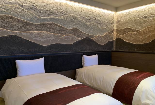 界 霧島ではご当地部屋を「薩摩シラス大地の間」と名付け、例えばベッドボードは火山噴出物のシラスを用いた抗菌性のシラス壁で霧島連山を表現。照明には薩摩和紙を採用し、調度品は薩摩錫器(さつますずき)、壁飾りに大島紬をあしらうなど、客室で地域の伝統工芸に触れられる。