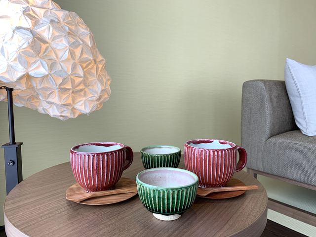 地元作家による照明と茶器。茶器をはじめ売店商品は客室からモバイルで購入できる。