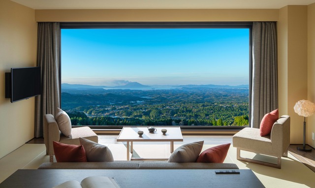 特別室は三方向の広い窓から桜島や高千穂峰を望む。