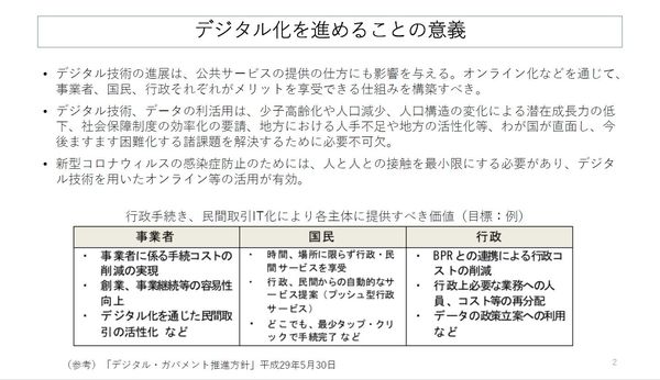 私は、手続きのオンライン化だけではなく、デジタル技術やデータの活用によって、例えば、少子高齢化、人口減少、あるいは潜在成長率の低下、社会保障制度の効率化、地方における人手不足や地方の活性化、こうした日本が直面している問題を解決するためにも、デジタル化が必要なのではないかと考えています。