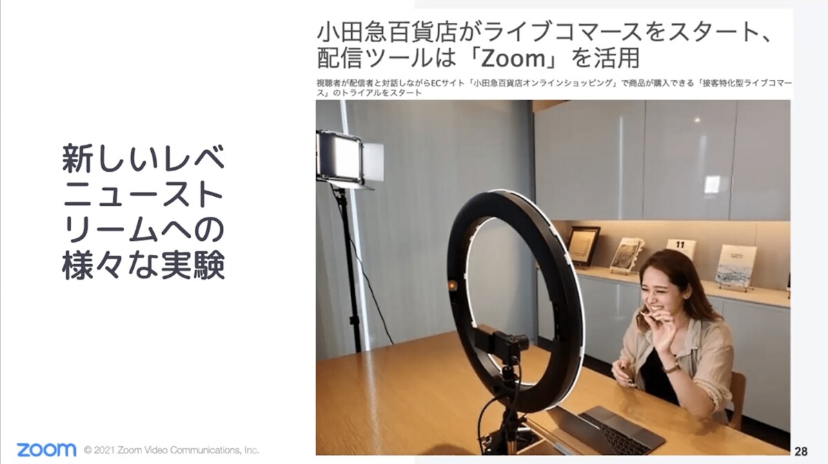 これはいわゆるテレビショッピングのようなものを、Zoomを使ってライブ配信されている風景です。1対1であっても、1対Nであっても、ライブで行うことによって、実際に店舗で接客を受けているような感覚になれることがメリットです。これからますます、新しい販売方法として広がっていくのではないかと考えております。