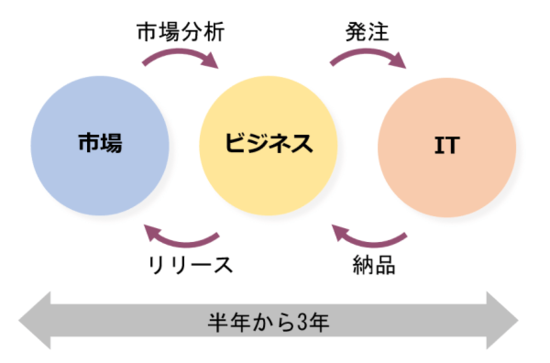 これまで、ビジネスの主体と、そのビジネスが対象とする市場(あるいはユーザー)、そして情報システム開発の主体(IT)は図2-1のような関係にあった。まずビジネスの主体が「市場分析」し、それを要求仕様書というドキュメントにまとめる。そしてそれを基にITにシステム開発を「発注」する。その後、ITはその要求を満たすべくシステムを開発し「納品」する。そしてビジネス主体が納品されたシステムを市場へと「リリース」する。ビジネスの主体と開発の主体の間には発注と納品という手続きがあり、契約を介することになる。