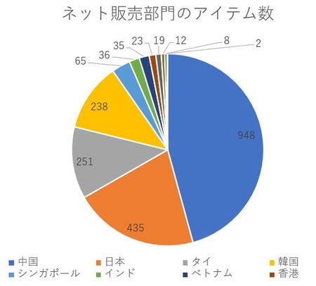 go asiaで取り扱う商品の国別の構成比(ネット販売部門に限る)を調べてみると、アジア12カ国のなかで、中国を原産国とするものがダントツに多く約46%に上る。そして2位が日本の約21%、3位がタイの約12%、4位が韓国の約11%と続く。