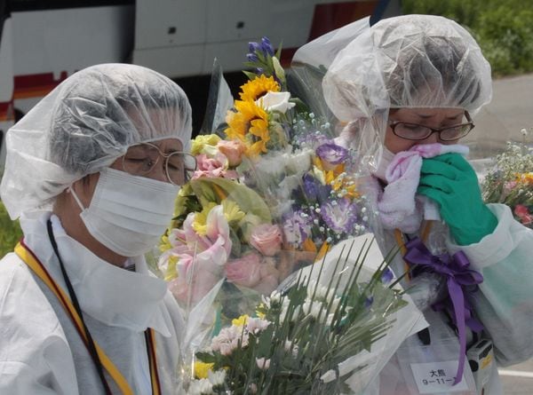 海岸部には、津波で壊れた建物が手付かずのまま風雨に晒されていた。そこに花や果物を供えた簡素な祭壇が設けられた。津波の犠牲となって亡くなった12人の合同慰霊祭がこれから始まる。参加者は50人程、足先からすっぽり覆う防護服に身を固め、頭にヘアーキャップ、顔にはマスク、手にはゴム手袋という姿だ。