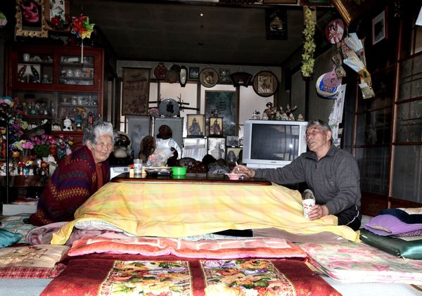 2012年3月初旬、再び佐藤さんを訪ねた。震災から一年、飯舘村は春にはまだ遠く、身を切るような寒風が山から里へ吹き下ろしていた。膝まで埋もれる残雪に冷たさを感じながら佐藤さんの家の前の坂道を登り縁側のガラス戸から声をかけると、二人は居間の炬燵に首まですっぽりと身を潜らせていた。