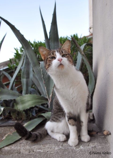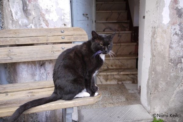 この猫は、民泊経営をしている家の猫です。お客さんが大好きで、去っていく旅人を見送るのが日課だそうです。そのあと、近所のお年寄りの世間話に加わったり、昼寝をしたりしているうちに、次のお客さんが到着する時刻になるのでお出迎え。なかなか忙しい日課です。