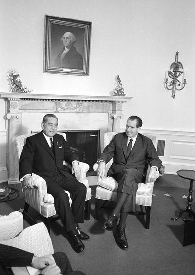 佐藤栄作首相とニクソン大統領の日米首脳会談の様子。1969年11月19日撮影(写真:AP/アフロ)
