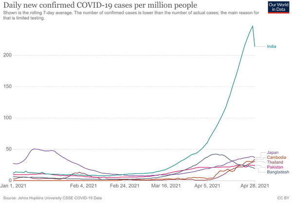 その原因はアジアに特有の「ファクターX」があるためではないかといわれてきたが、今年3月からインドで感染爆発が起こり、感染者は毎日36万人以上、死者は3000人以上になった。今まで比較的安全だと思われていたアジアで、何が起こっているのだろうか。