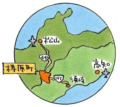 高知県梼原町は愛媛県との県境にある(記事中イラストはすべて宮沢洋、『隈研吾建築図鑑』用に作成したもの)