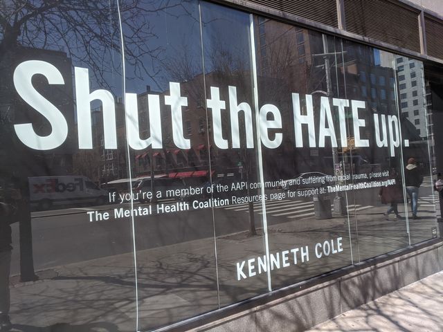 アジア系住民へのヘイトクライムが報道され始めて、街なかのウィンドウケースにもこんなサインが張られた