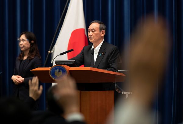 5月7日、3度目となる緊急事態宣言の「延長」を発表し、記者から質問を受ける菅義偉首相(写真:代表撮影/ロイター/アフロ)