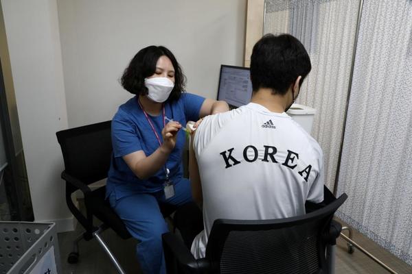 新型コロナウイルス感染症用ワクチンの接種を受ける韓国の柔道五輪代表選手(4月29日、写真:代表撮影/ロイター/アフロ)